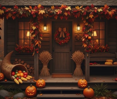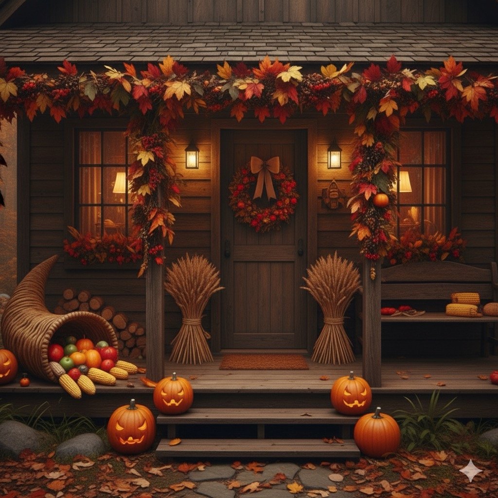 To get that authentic 'cabin' feel, mix natural textures. Use hay bales to create varying heights for your pumpkins. Incorporate galvanized metal buckets or old wooden crates to hold firewood or extra throw blankets near the door