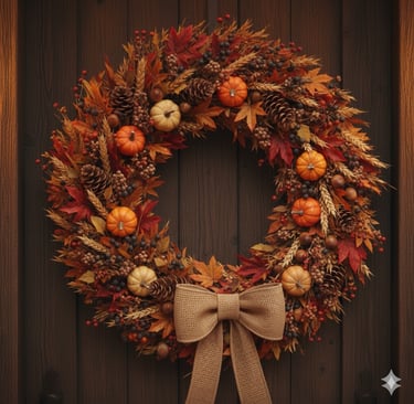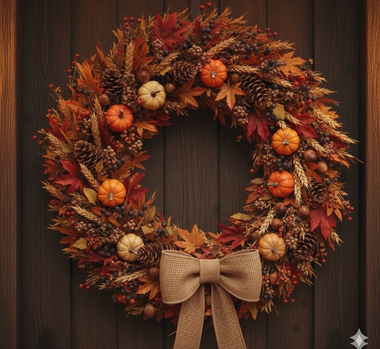 Anchor the lot with a large wreath featuring dried leaves, pine cones and warm autumn hues.