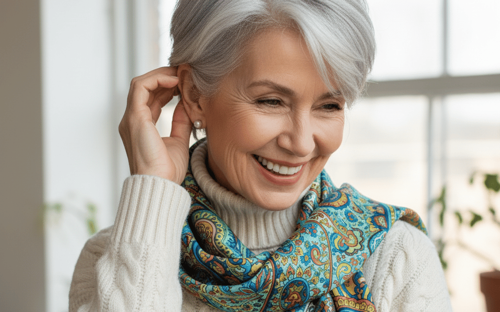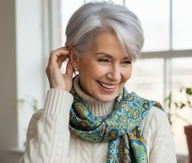 Discover the art of effortless winter style with this chic look! A perfectly paired cream cable-knit turtleneck sweater creates a canvas for a stunning, vibrant paisley silk scarf. Learn how to add a pop of color and sophistication to any outfit, transforming cozy basics into a statement of ageless elegance. Get inspired to experiment with textures and patterns this season and elevate your everyday style!