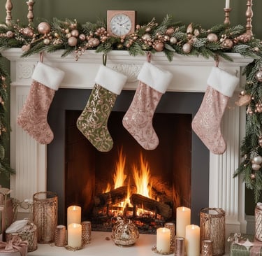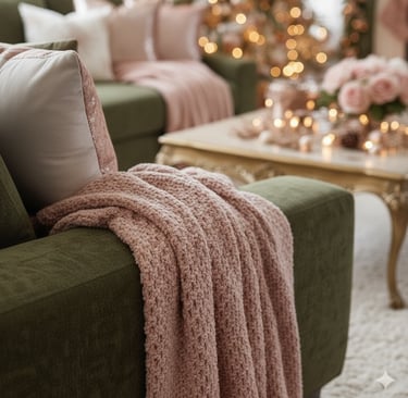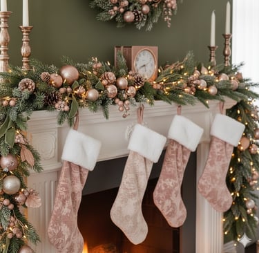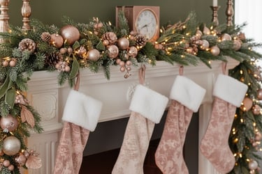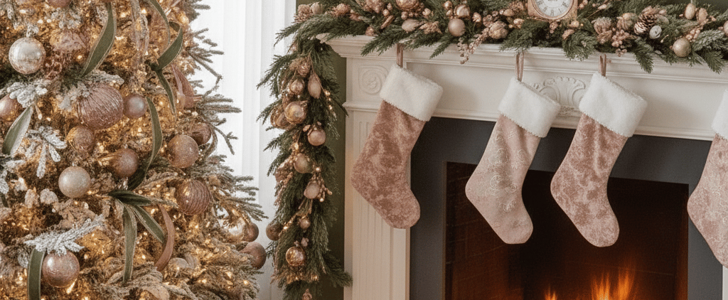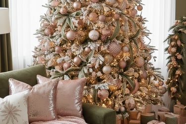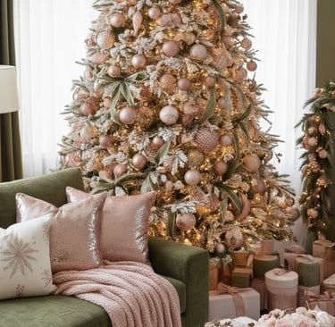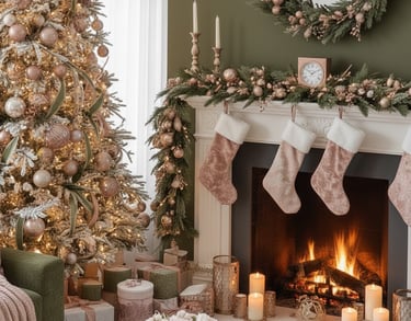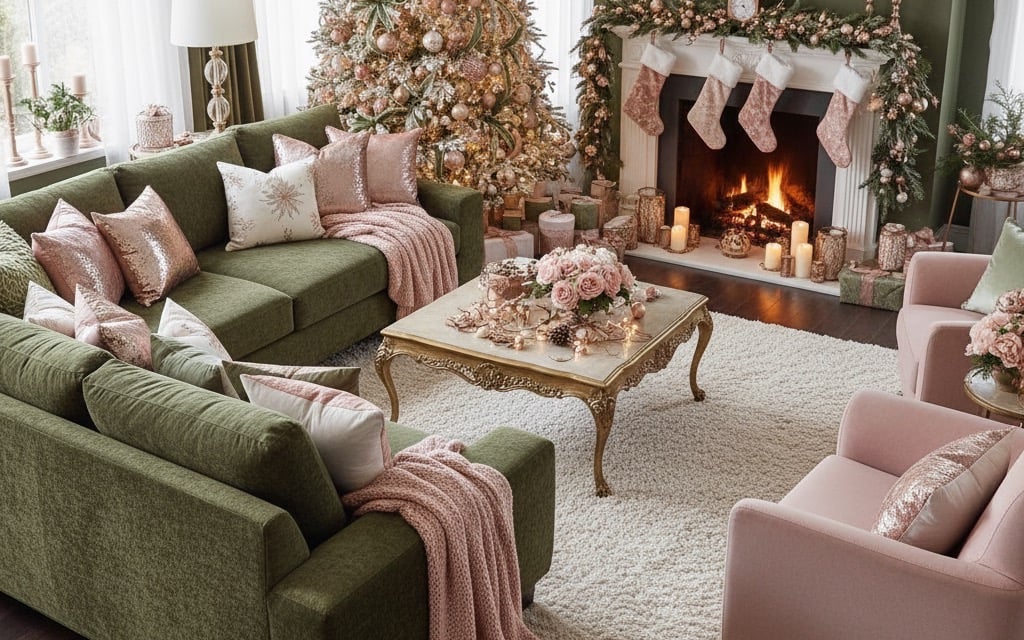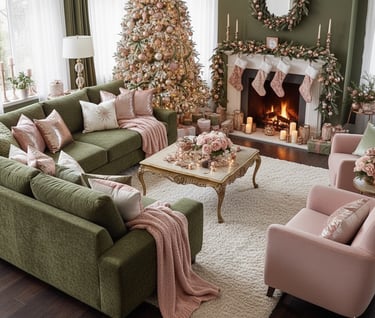 Step into a truly luxurious holiday haven with this stunning Christmas living room! Experience the magic of a sophisticated color palette featuring rich olive green sofas beautifully complemented by soft blush pink and shimmering rose gold accents. From the exquisitely decorated Christmas tree to the cozy fireplace garland and plush throw blankets, every detail creates an atmosphere of elegant warmth and festive comfort. Perfect for those seeking a unique, glamorous, and unforgettable holiday aesthetic. Get inspired to design your dream Christmas living room decor!