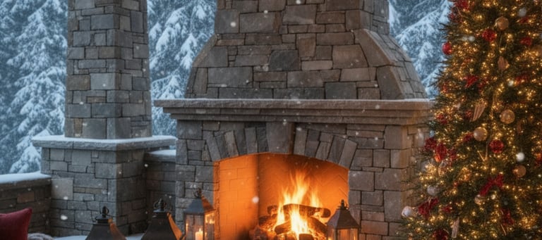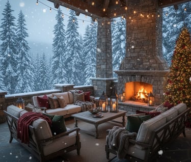 Imagine escaping to this breathtaking winter wonderland! This luxurious outdoor patio offers the ultimate cozy retreat, complete with a magnificent stone fireplace casting a warm glow amidst falling snow. Plush outdoor furniture, rich red and green accents, and a beautifully lit Christmas tree create an enchanting atmosphere perfect for gathering with loved ones or enjoying peaceful solitude. Discover how to transform your own patio into a magical outdoor living room for the colder months. Get inspired for your winter patio decor and outdoor Christmas ideas!"