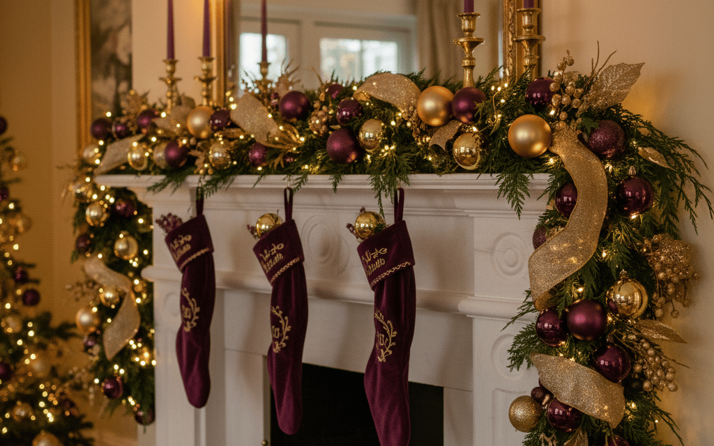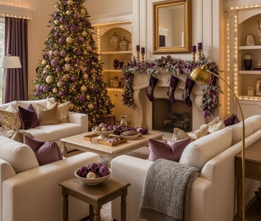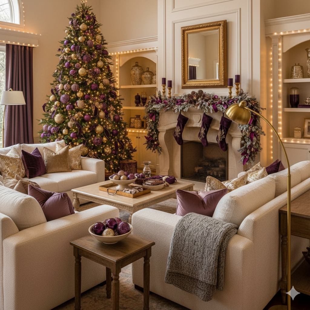 Get inspired by this cozy living room, featuring a stunning Christmas tree and mantel decorated with luxurious deep purple and radiant gold accents. Discover tips for choosing plush furniture, elegant holiday styling, and creating a truly regal atmosphere for your celebrations. Perfect for a chic and inviting Christmas.