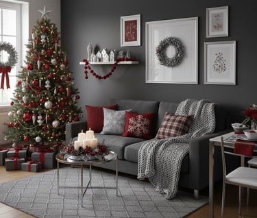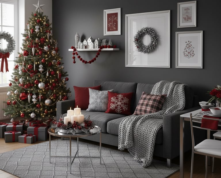 Maximize your festive style, even in a small space! Get inspired by this cozy, modern apartment decorated for Christmas with a chic color palette of charcoal grey, sparkling silver, and pops of vibrant red. Discover smart decorating tips, DIY ideas, and product links to create a stylish and inviting holiday home, perfect for urban living.