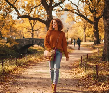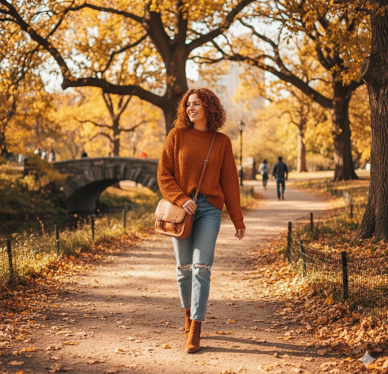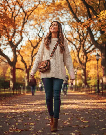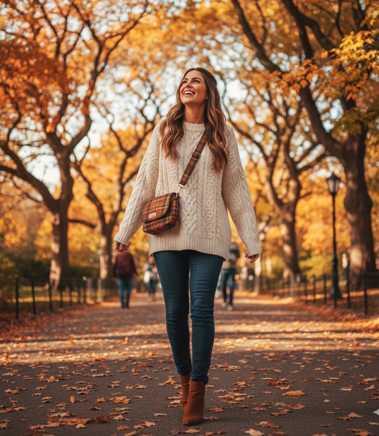 The classic cream cable knit sweater paired with dark wash jeans and comfy suede ankle boots is the ultimate fall outfit formula for comfort and elegance. She's rocking a plaid crossbody sling bag that adds a cute pop of color to the ensemble.