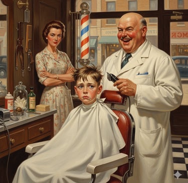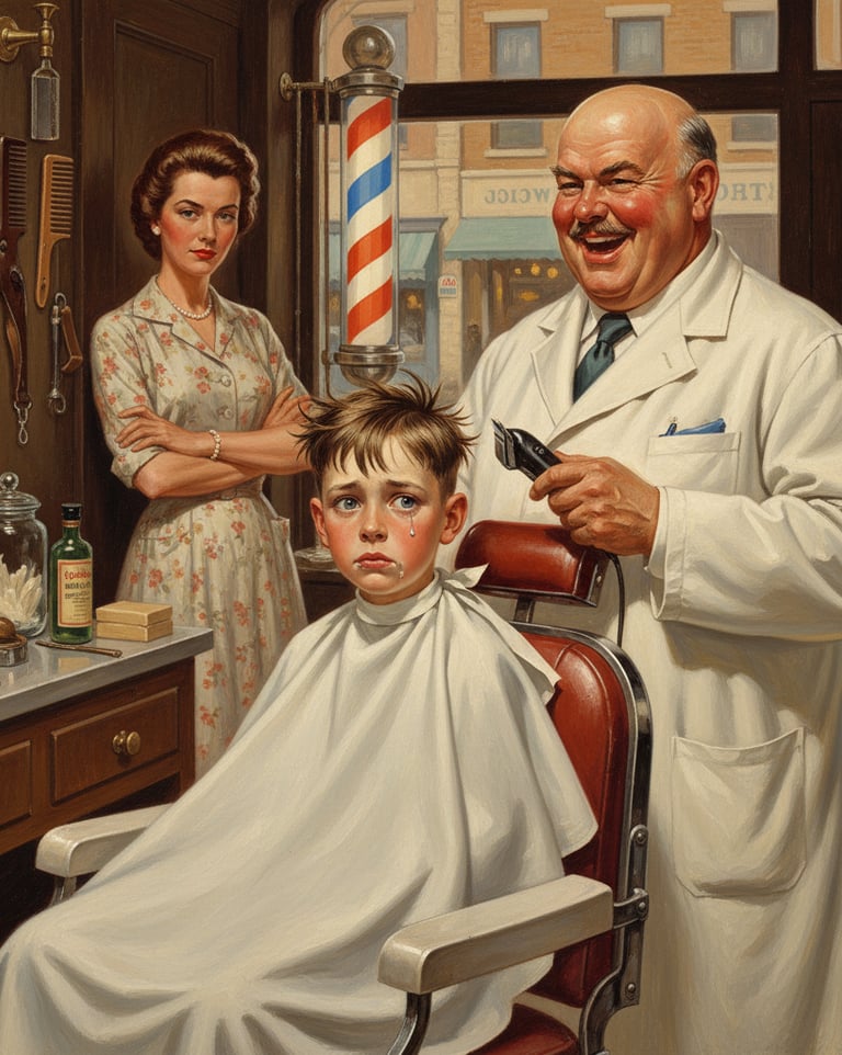 A nostalgic, Norman Rockwell-style painting capturing the universal childhood dread of a first haircut. A tearful young boy sits in the classic barber chair, looking miserable, while the jolly barber holds the clippers ready. The elegant mother observes the scene, making sure this awkward moment is a rite of passage. This piece perfectly captures mid-century American nostalgia and the funny, painful experience of growing up.